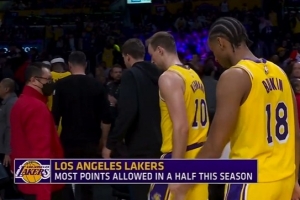 上半場,殘陣湖人讓對手轟下84分,創(chuàng)下球隊本賽季半場失分紀錄。