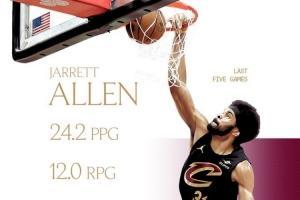 體育資訊2月13日訊 今日,騎士官方在社交媒體曬出了球隊中鋒賈勒特·阿倫過去5場比賽的數(shù)據(jù)。