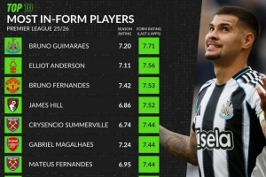 whoscored英超近期狀態(tài)榜:近6輪平均分