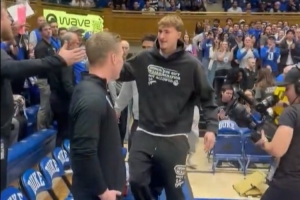 體育資訊2月15日訊 今天,因左腳中足扭傷而缺席了全明星新秀賽的弗拉格回到杜克大學(xué)觀戰(zhàn),對(duì)手為克萊姆森大學(xué)。