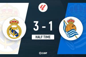 上半場補時4分鐘。半場戰(zhàn)罷,皇馬3-1皇社。