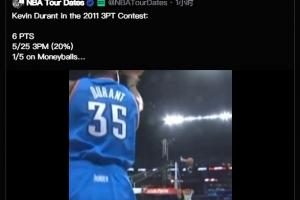 有網(wǎng)友轉(zhuǎn)發(fā)了杜蘭特2011年參加三分大賽的集錦,他當(dāng)年總得分僅得到6分,25投5中(命中率20%)、花球5投1中。