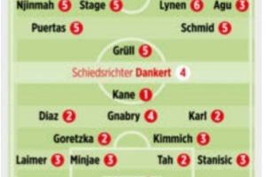全文摘要:德甲第22輪,拜仁客場3-0完勝不萊梅?!秷D片報》賽后評分顯示,拜仁前鋒凱恩以1分獲全場最低分,主帥孔帕尼僅得2分。反觀不萊梅,門將巴克豪斯以3分成為全場最差球員,主帥蒂奧內(nèi)也僅獲4分。