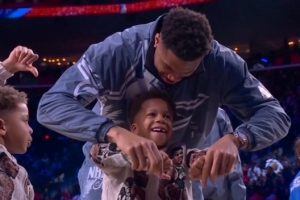 比賽中,倫納德化身戰(zhàn)神卡,字母哥的兒子在場邊豎起大拇指為倫納德加油,作為世界隊的一員,字母哥趕緊按下兒子的雙手,并教他拇指向下噓。