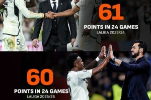 本賽季,皇馬在西甲24輪后拿到了60分,創(chuàng)造隊史第三高的24輪后積分。