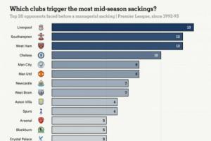 第二、第三名分別為南安普頓和西漢姆,均為12次,緊隨其后的則是切爾西、曼城和曼聯(lián)。 ???