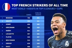 法國球員參與進球排名(五大聯(lián)賽+杯賽):