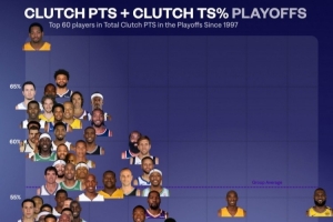 體育資訊9月29日訊 近日,數(shù)據(jù)媒體NBA University總結(jié)了自從1997年以來(NBA官網(wǎng)該項數(shù)據(jù)統(tǒng)計起始時間)在NBA季后賽中關(guān)鍵得分前60球員的真實命中率分布圖表。