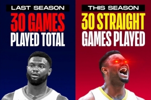 體育資訊2月20日訊 據(jù)統(tǒng)計,錫安賽季至今共計出場40場比賽,且已經(jīng)連續(xù)出場了30場比賽。
