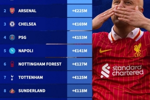 2.阿森納 +2.25億歐