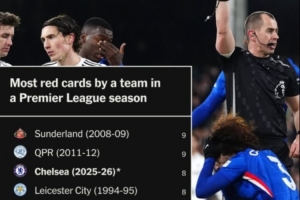 切爾西(2025-26賽季)、萊斯特城(1994-95賽季)、布萊克本(1998-98賽季)、西漢姆(1999-2000賽季)、紐卡(2008-09賽季)、桑德蘭(2013-14賽季):8紅