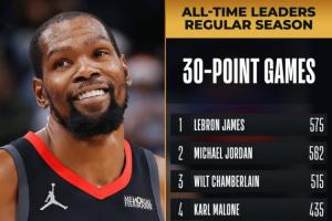這是杜蘭特生涯第430場得分30+,升至NBA歷史第6,還差1場就能追平科比。