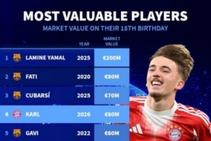球員18歲生日當(dāng)天德轉(zhuǎn)身價(jià)排名: