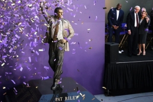體育資訊2月23日訊 今日湖人為球隊傳奇主教練帕特·萊利舉行雕像揭幕儀式。