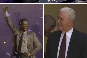 這場(chǎng)賽前,湖人為名宿帕特·萊利舉行雕像揭幕儀式,談到萊利,詹姆斯說(shuō):“他是這個(gè)聯(lián)盟有史以來(lái)最偉大的人物之一。不僅是作為球員、教練,還有管理層,方方面面都是。顯然,他在80年代為湖人隊(duì)所做的一切,那些都是毋庸置疑的傳奇,他也完全配得上在這座球館外擁有雕像?!?/p>