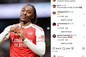 體育資訊2月23日訊 英超第27輪,阿森納客場(chǎng)4比1大勝熱刺,笑傲北倫敦德比。賽后,梅開(kāi)二度的埃澤更新社媒慶祝勝利。