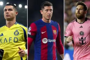 目前在現(xiàn)役球員射手榜上,C羅946球第一,梅西884球第二,萊萬700球排在第三。