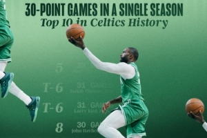 據(jù)統(tǒng)計,這是他本賽季第28次得分30+,闖進(jìn)凱爾特人隊史單賽季30+場次前十,追平塔圖姆上賽季和2021-22賽季的紀(jì)錄。