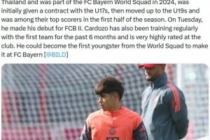 報道稱這位在泰國長大的巴西小將曾在2024年入選拜仁世界隊。最初他與U17梯隊簽約,隨后升入U19梯隊,并在賽季前半段成為該隊的主要得分手之一。本周二他首次代表拜仁二隊出場。在過去六個月里,卡爾多佐還經(jīng)常與一線隊一起訓練,并在俱樂部中備受好評。他有望成為首位從世界隊脫穎而出并成功進入拜仁一線隊的年輕球員。
