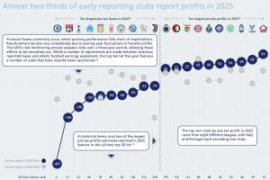 體育資訊2月27日訊 根據(jù)歐足聯(lián)公布的文件,盈利方面,2025年稅前利潤排名前十的俱樂部來自八個不同聯(lián)賽,其中意大利和葡萄牙各有兩家俱樂部入圍。里爾以9400萬歐元稅前利潤領(lǐng)跑,利潤占收入比重達(dá)49%。
