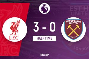 上半場傷停補時4分鐘,半場結(jié)束,利物浦暫3-0西漢姆聯(lián)。
