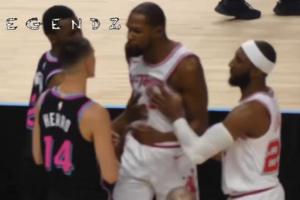 距離首節(jié)結束還剩5分鐘時,熱火就開始包夾杜蘭特,希羅這時候就開始噴垃圾話。