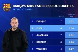 體育資訊3月3日訊 德國轉(zhuǎn)會市場統(tǒng)計(jì)了各教練執(zhí)教巴薩前100場的場均積分,并列出榜單,恩里克2.51分居首,弗里克2.34分次席。