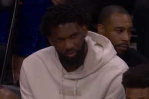 本場(chǎng)因右側(cè)腹斜肌拉傷而缺席比賽的76人核心恩比德,在球隊(duì)落后時(shí)坐在替補(bǔ)席面帶笑意。