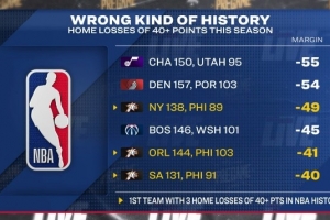 轉(zhuǎn)播方賽前曬出一組數(shù)據(jù),本賽季共有6次主隊(duì)輸球至少凈負(fù)40分的情況: