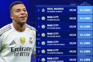 歐冠歷史身價差距最大比賽排行↓(本賽季阿森納對陣凱拉特交鋒也將躋身榜單,但由于球員身價將在后續(xù)更新中調整,故暫未列入本次統(tǒng)計)