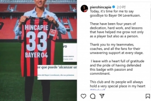 體育資訊9月2日訊 阿森納已經(jīng)官宣引進(jìn)勒沃庫森中衛(wèi)因卡皮耶,后者也通過社媒發(fā)文向藥廠告別: