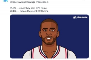 美媒曬出數(shù)據(jù),快船送走保羅前勝率23.8%,送走保羅之后的勝率為61.9%。