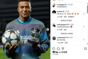 本場比賽姆巴佩上演帽子戲法,賽后他也在社媒曬出與全場最佳獎杯以及比賽用球的合影。