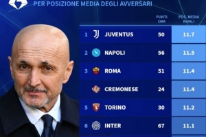 體育資訊3月11日訊 德國轉(zhuǎn)會市場統(tǒng)計了意甲各隊剩余10輪對手的平均排名,并列出榜單,尤文的對手平均排名最低。