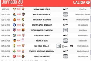 體育資訊3月14日訊 西甲官方公布了第30輪比賽時(shí)間,4月4日22點(diǎn)15分馬略卡vs皇馬,4月5日3點(diǎn)馬競vs巴薩。