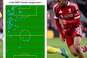 體育資訊3月16日訊 恩古莫哈在利物浦1-1熱刺的比賽中首次在英超首發(fā),英超官方曬出了他的熱區(qū)圖。