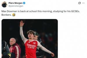 體育資訊03月16日訊 今天是周一,英國名嘴、著名阿森納球迷皮爾斯·摩根社媒發(fā)帖,調(diào)侃阿森納16歲小將道曼今天還要去上學。