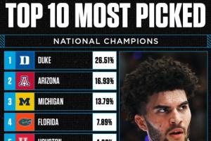 據(jù)統(tǒng)計,杜克大學(xué)目前是奪冠最大熱門,支持率高達(dá)26.51%位居榜首。亞利桑那大學(xué)(16.93%)和密歇根大學(xué)(13.79%)分列二三。之后是佛羅里達(dá)大學(xué)、休斯敦大學(xué)、岡薩加大學(xué)、普渡大學(xué)、康涅狄格大學(xué)、阿肯色大學(xué)和愛荷華州大。排在前四的正是四大賽區(qū)的一號種子。