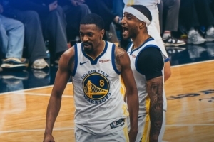 賽后勇士官方發(fā)布贏球海報(bào),封面人物為梅爾頓和小佩頓。