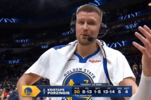 本場(chǎng)比賽,波爾津吉斯出戰(zhàn)26分鐘,13中8,14罰13中砍下勇士生涯新高的30分外加5板4助2斷3帽。