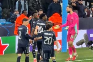 維尼修斯補(bǔ)時(shí)上演梅開二度后,對(duì)著球迷展示球衣。隨后曼城門將多納魯馬攤手與其溝通表達(dá)不滿。
