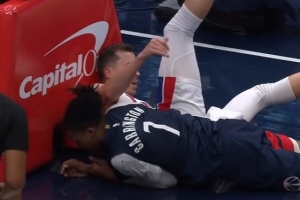 GIF-卡林頓空接暴扣,下來(lái)后順帶帶倒鄧羅,裁判吹鄧羅防守犯規(guī)后還追加杜倫T;活塞挑戰(zhàn)后,又追加卡林頓T