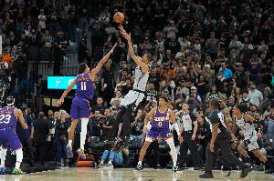 落后1分敢壓時間!文班亞馬連續(xù)晃動后運一步干拔后仰準絕殺太陽
