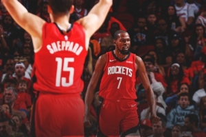 賽后火箭官方發(fā)布贏球海報,杜蘭特和謝潑德(背影)成為封面人物。