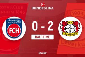上半場(chǎng)比賽結(jié)束,海登海姆0-2勒沃庫(kù)森。