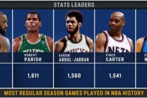 歷史出場(chǎng)數(shù)排名:詹姆斯1612場(chǎng)、帕里什1611場(chǎng)、賈巴爾1560場(chǎng)、卡特1541場(chǎng)、諾維斯基1522場(chǎng)