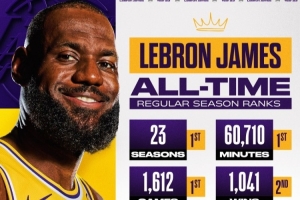 體育資訊3月23日訊 今天,NBA官方曬出詹姆斯一系列的常規(guī)賽數(shù)據(jù)。具體如下: