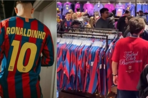 在周日對陣賽前,巴薩球員全員身著印有羅納爾迪尼奧10號的2005/06賽季巴黎歐冠決賽版球衣亮相,這一致敬經(jīng)典的舉動迅速點燃了球迷的購買欲。