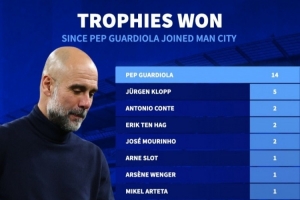 自瓜迪奧拉加入曼城以來,英超俱樂部贏得獎杯數(shù)據(jù)排名: