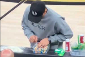 體育資訊3月27日訊 昨日勇士109-106戰(zhàn)勝籃網(wǎng),有網(wǎng)友的鏡頭捕捉到庫里在場邊偷偷藏糖果一幕。